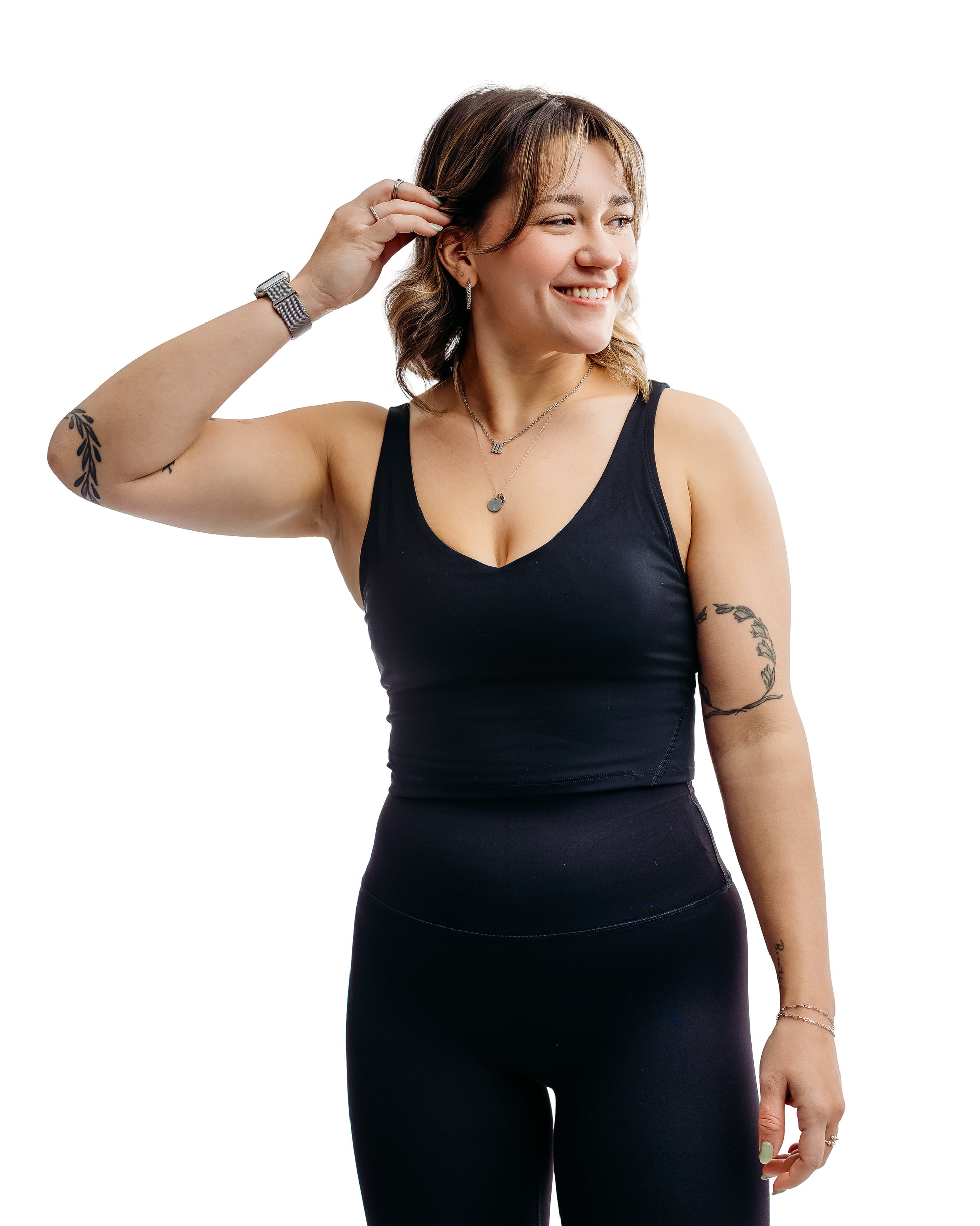 :The Victoria sports bra is made of breathable, stretchy fabric. It offers a comfortable fit and moderate support. Its V-neck and camisole-style length offer a relaxed look that pairs perfectly with the Ana leggings or a pair of jeans!