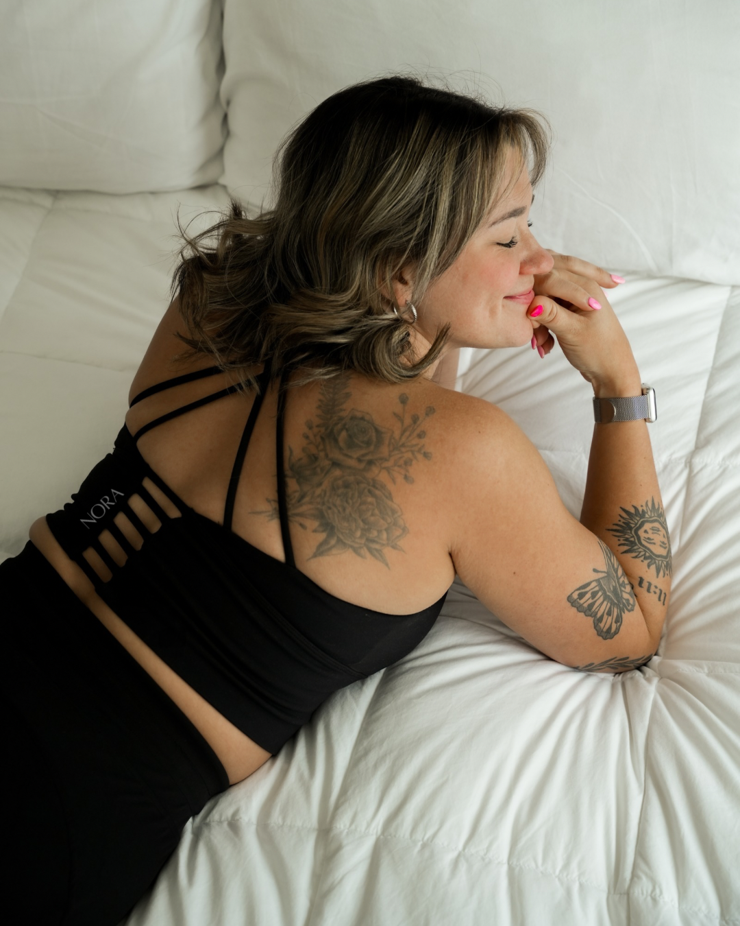 The Saskia sports bra is made of breathable, stretchy fabric. It offers a comfortable fit and moderate support. Its camisole-style length offers a relaxed look that pairs perfectly with Maé pants or jeans!